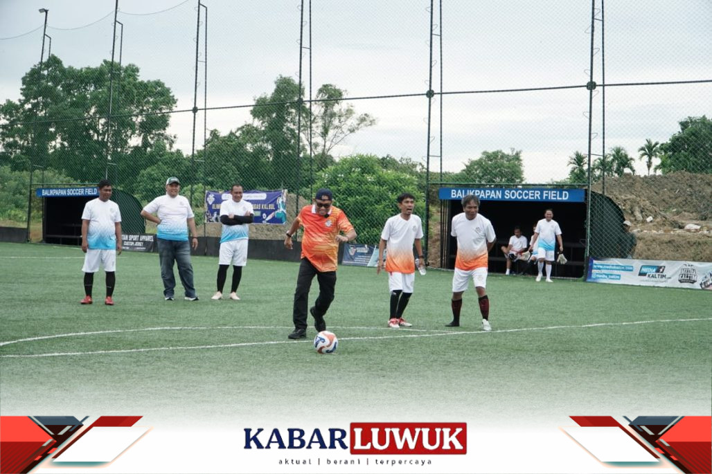 Sebagai tanda dimulainya rangkaian kegiatan, Azhari Idris didaulat melakukan tendangan kehormatan, menandai dibukanya secara resmi Olimpiade Media SKK Migas Kalsul 2025. (Irwan)