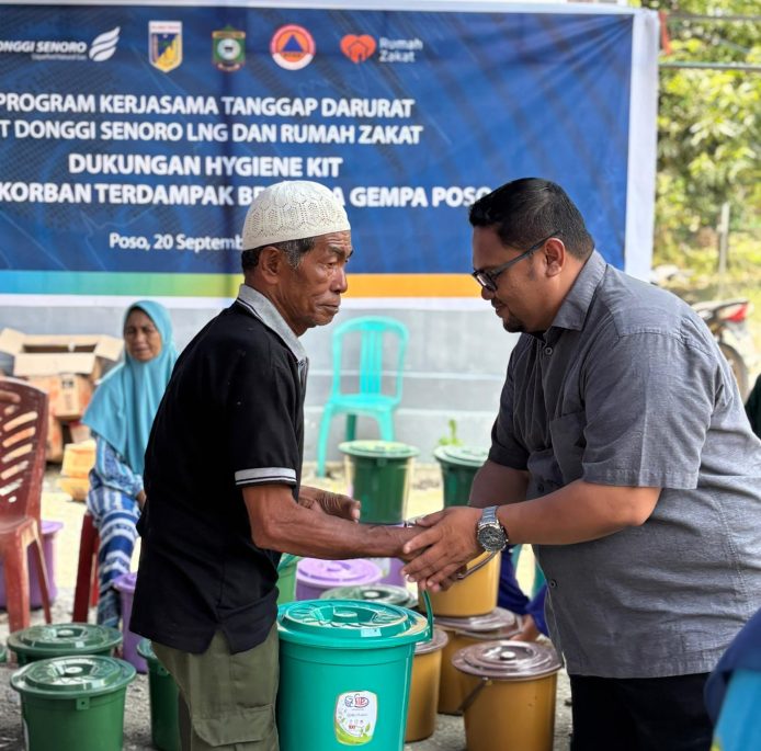 Di Poso, bekerja sama dengan Rumah Zakat, DSLNG menyalurkan 100 paket Hygienekit kepada penyintas di Desa Lape, Kecamatan Poso Pesisir, Kabupaten Poso, pada Sabtu (20/9/2025).
