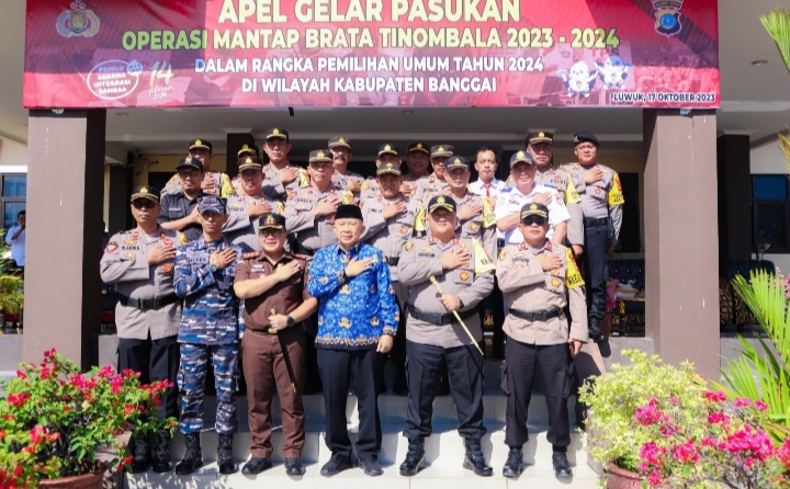 KABAR LUWUK – Kapolres Banggai, AKBP Ade Nuramdani, SH, SIK, MM, memimpin langsung apel gelar pasukan Operasi Mantap Brata 2023-2024 dalam rangka pengamanan Pemilu 2024 di lapangan Mapolres Banggai pada Selasa, 7 Oktober 2023.
