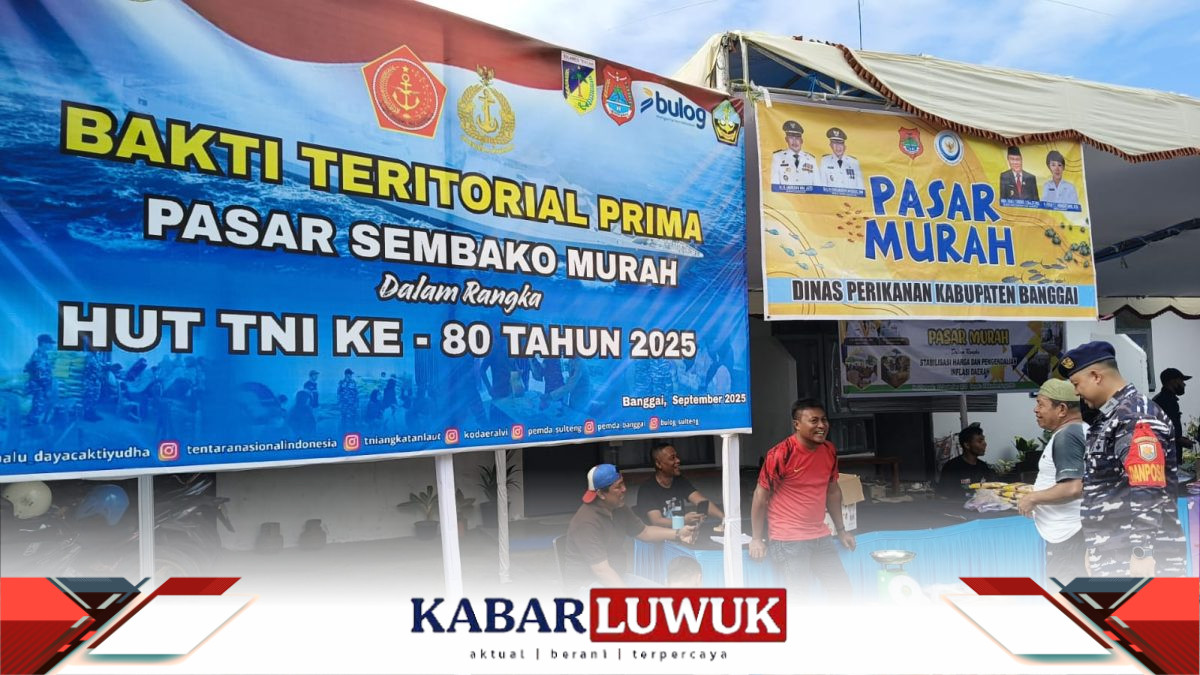 KABAR LUWUK — Dalam rangka HUT TNI ke 80 tahun 2025 mendukung program Bakti Teritorial Prima TNI, Pos TNI AL Luwuk (Posal Luwuk) di bawah jajaran Pangkalan TNI AL (Lanal) Palu menggelar kegiatan Pasar Sembako Murah bagi masyarakat sekitar.