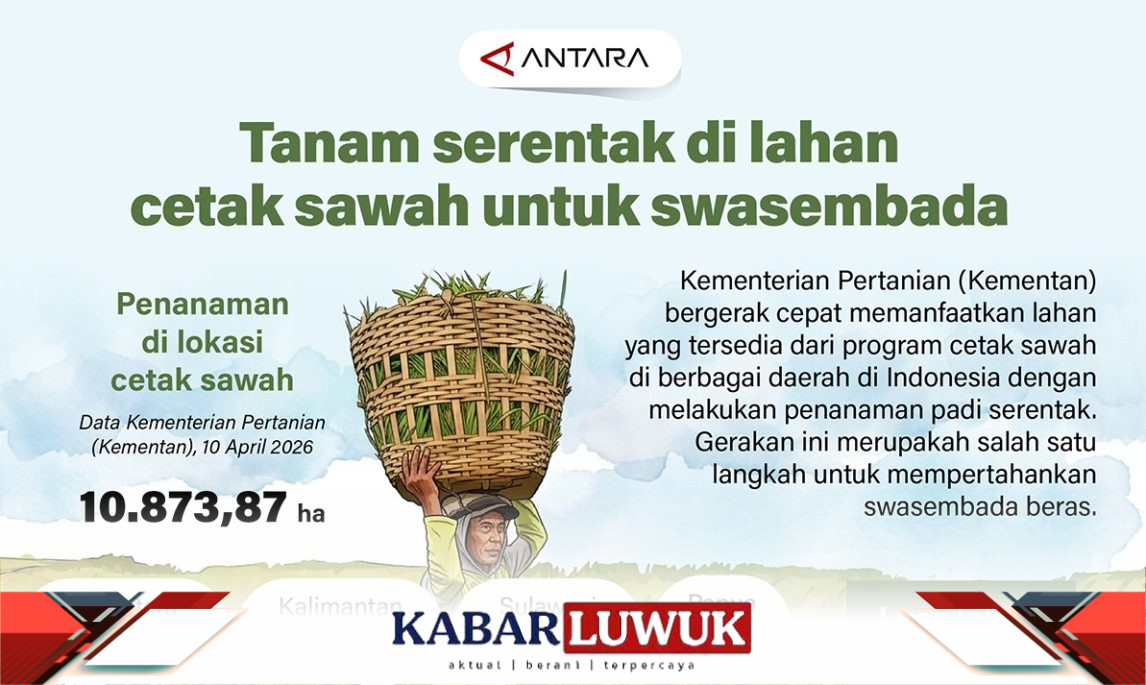 KABAR LUWUK – Kementerian Pertanian (Kementan) bergerak cepat memanfaatkan lahan yang tersedia dari program cetak sawah di berbagai daerah di Indonesia dengan melakukan penanaman padi serentak. Gerakan ini merupakah salah satu langkah untuk mempertahankan swasembada beras. (ANTARA)